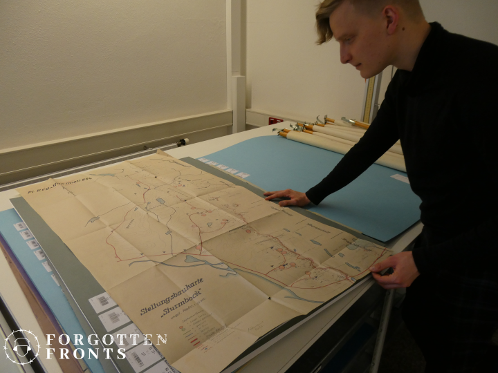 Aleksi Rikkinen Sturmbock-aseman linnoitteita kuvaavan pioneerikartan äärellä Freiburgin sotilasarkistossa Saksassa. Laajat arkistutkimukset täydensivät merkittävästi maastotutkimuksissa kertynyttä tietoa